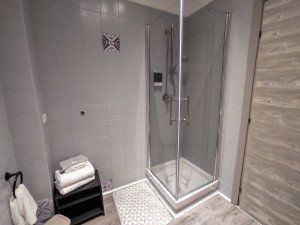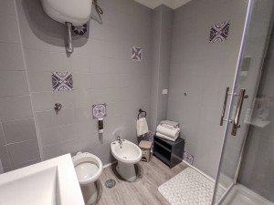 Dispenser di detergenti (doccia, shampoo, intimo, mani), carta ingienica, tappeto doccia e asciugamani da bagno.